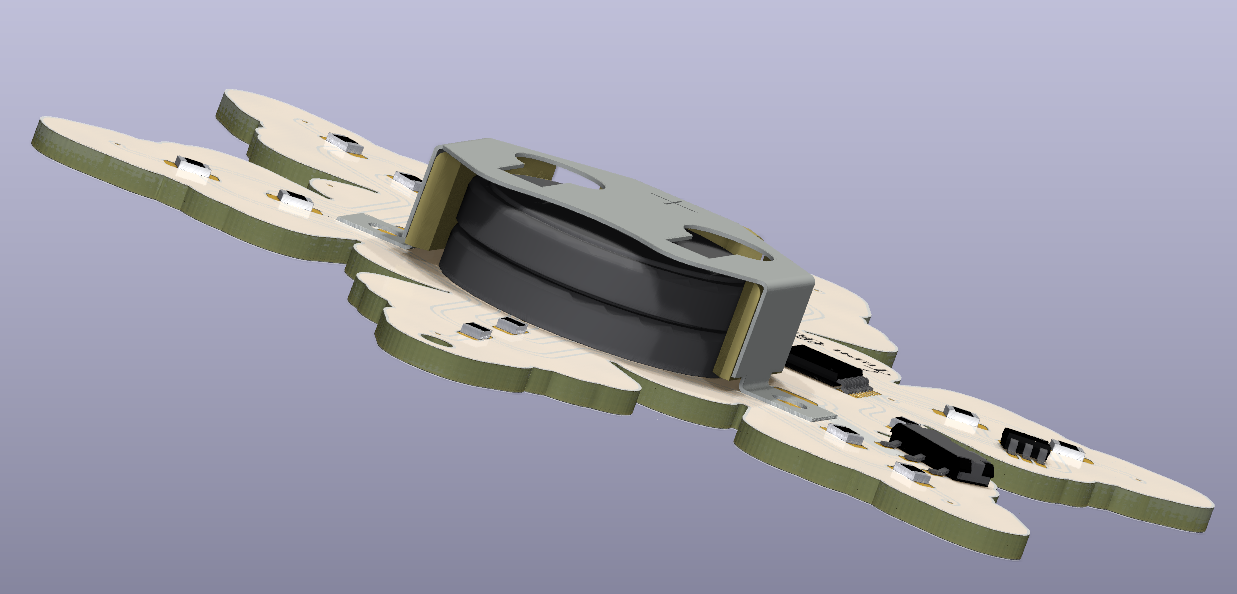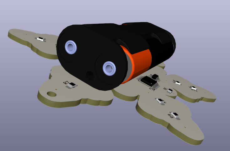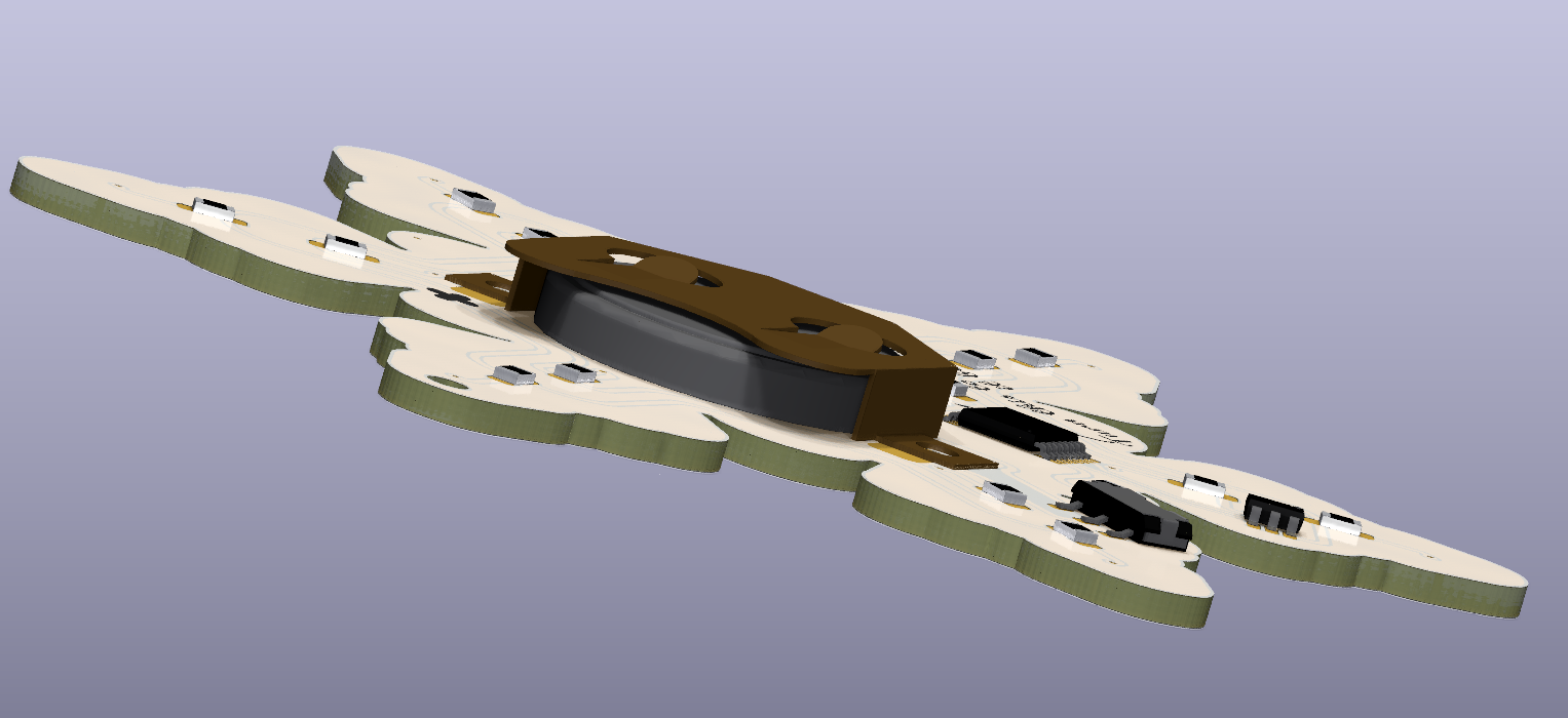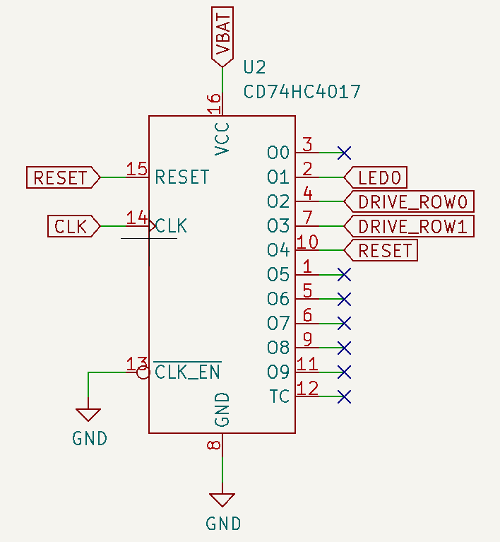 In order to cycle through the different elements, the central LED (LED0) is connected to output 1, the inner ring is connected to output 2 and the outer ring is connected to output 3. Output 0 is left unconnected to provide a pause between cycles (and also reduce a bit the average battery draw). Output 4 is connected to the reset pin, so as soon as it gets active, the counter resets and the cycle starts again.