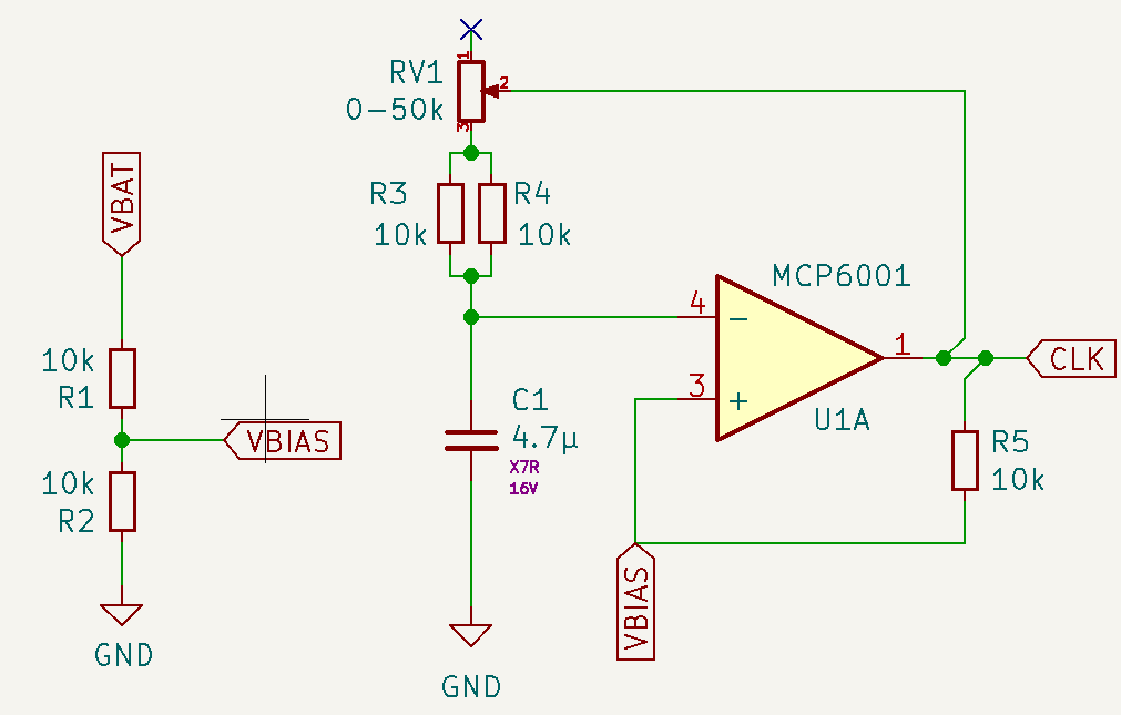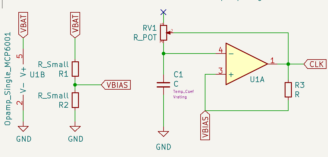 To generate the clock signal, we use an Op Amp in astable vibrator configuration. It’s made by two elements, a Schmitt trigger and an RC circuit connected to the inverting pin of the opamp. Because we are using a single rail to power the op amp, we have to bias the non-inverting pin.